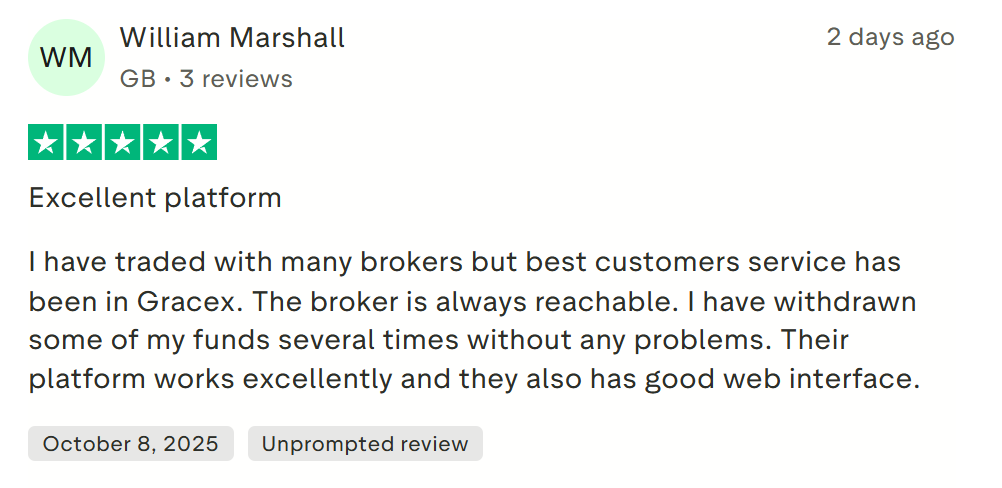 Начал сотрудничать с Gracex по рекомендации коллег. Платформа показала себя хорошо: чёткое исполнение, удобная структура меню, корректная работа всех инструментов. Сервис оставляет положительное впечатление.